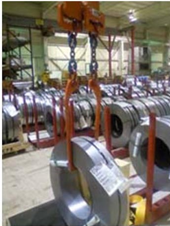 其配套使用的吊鉤具有2英寸的調(diào)節(jié)范圍,可以搬運和移動不同厚度的卷材。Coil Plus部門維護與安全負責人Larry Wood表示,其主要特點是底腳可以進行旋轉(zhuǎn),為便于鋼卷移動,吊鉤可以向下移動,這樣底腳可以降低到與鋼卷平行的位置。當?shù)啄_到達鋼卷所處的位置時可以實現(xiàn)90°旋轉(zhuǎn),這樣就可以對目標鋼卷進行起吊作業(yè)而不磕碰相鄰位置上的其他鋼卷。