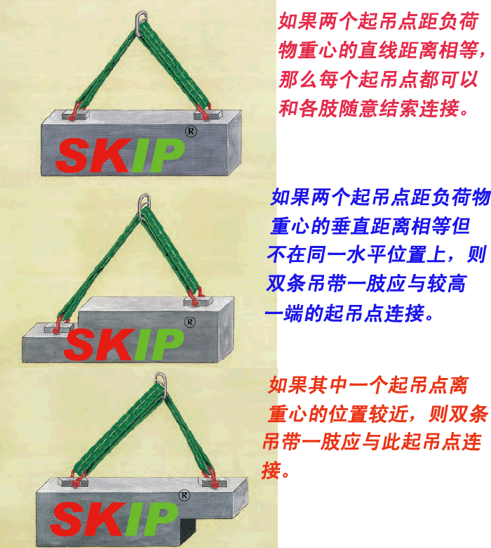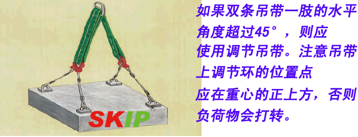 這是一種雙肢吊帶索具,其中一肢是另外一肢的2倍工作載荷。利用外力調(diào)節(jié)活動肢的長度可以使吊帶頂端的受力點處于負(fù)荷物的正上方,從而實現(xiàn)平穩(wěn)起吊。為保證靈活使用,操作者必須按照正確方法使用可調(diào)節(jié)式雙肢吊帶索具。其中帶有雙條吊帶的一肢承擔(dān)較大比例的負(fù)荷重量,而單條吊帶的一肢只承擔(dān)較小比例的負(fù)荷重量。