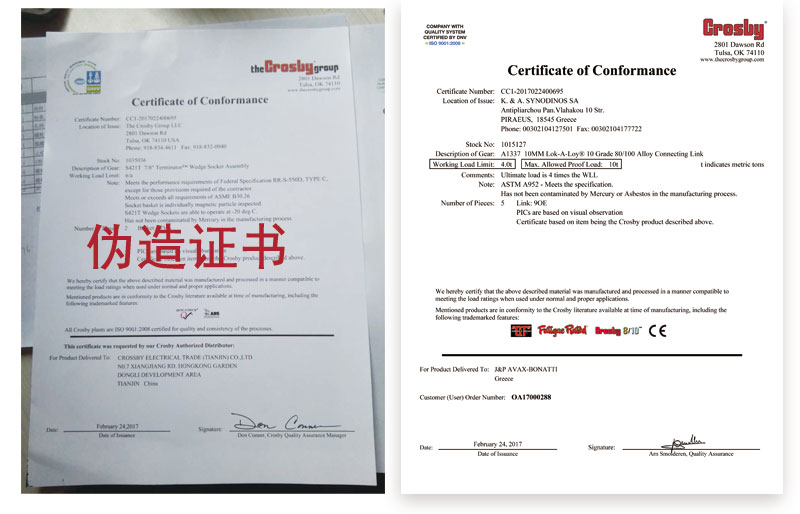 Crosby最近收到市場(chǎng)反饋,天津科索比機(jī)電貿(mào)易公司提供偽造的Crosby產(chǎn)品證書(shū),并以此銷(xiāo)售Crosby產(chǎn)品。