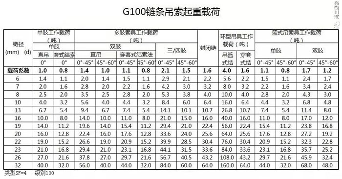 起重吊裝是一項高危險系數(shù)的作業(yè)任務,選擇適用的索具用于既定的作業(yè)用途是司索工在日常工作中需要掌握的必備工作技能之一,為達到安全可靠的作業(yè)效果,司索工需要掌握很多方面的專業(yè)技能知識作為工作支撐。這包括了一些基本的物理學知識、設備相關的產(chǎn)品知識和其他一些基本的機械工程專業(yè)知識等。以下是G100鏈條索具快速選型表,包括單肢,多肢,環(huán)吊和籃吊起重載荷表,司索工依據(jù)鏈條索具選型表可以快速做出最正確合理的決定,以將其在作業(yè)中發(fā)揮最合理的安全保障效用。