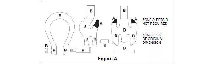 ● 停止使用:集成主環(huán)或配件如出現(xiàn)裂紋,缺口時,需要請專業(yè)人員對產(chǎn)品進行修理,專業(yè)人員必須沿鍛件輪廓進行垂直磨修,并保證尺寸的損耗不超過表 fig A 中規(guī)定的范圍,如超出此范圍,則產(chǎn)品不能再使用。