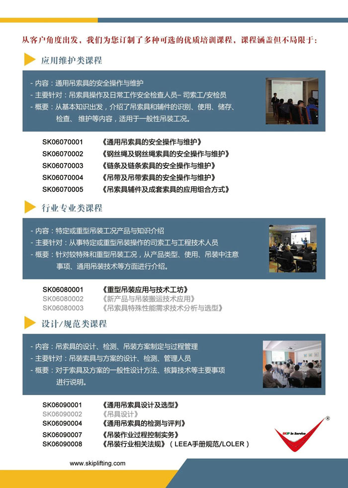 GLE作為英國(guó)吊裝工程師協(xié)會(huì)(LEEA)的會(huì)員單位,SafeX專(zhuān)業(yè)培訓(xùn)擁有自己的國(guó)內(nèi)專(zhuān)業(yè)培訓(xùn)團(tuán)隊(duì)和國(guó)際知名培訓(xùn)專(zhuān)家的特邀團(tuán)隊(duì),可以提供中英文培訓(xùn)服務(wù),并可以為客戶訂制的專(zhuān)項(xiàng)內(nèi)容實(shí)施課程開(kāi)發(fā)和培訓(xùn)計(jì)劃。