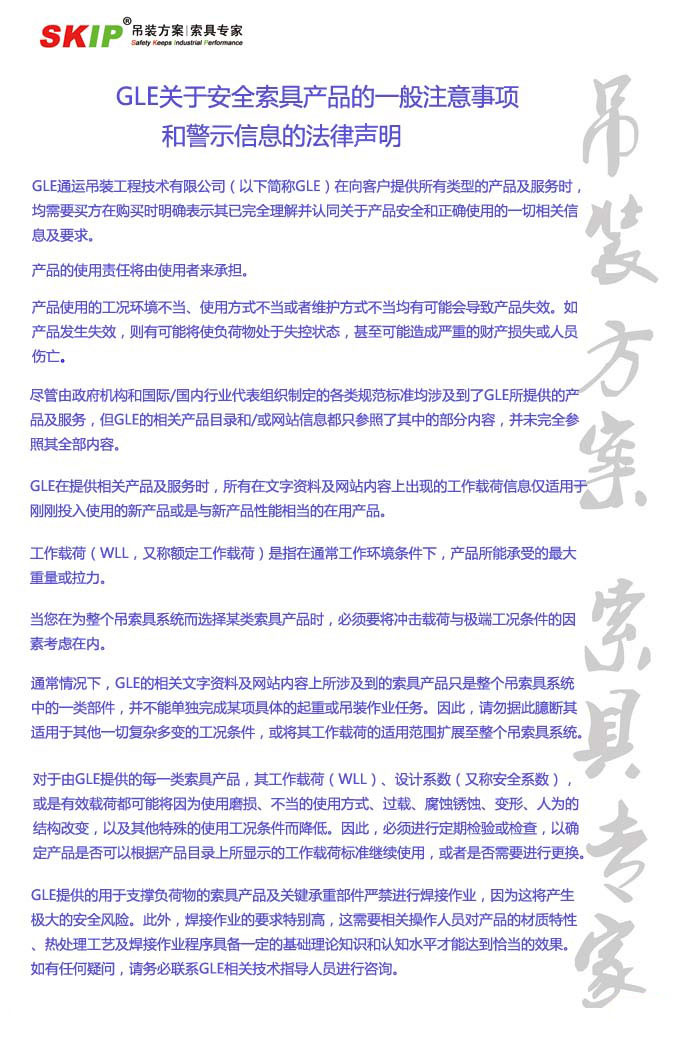 鄭重聲明:www.qiongning.cn為我公司合法合規(guī)官方網(wǎng)站。 GLE為美國CROSBY及英國Straightpoint在中國大陸合作伙伴, 進(jìn)口Kuplex8+10品牌索具系列輔件產(chǎn)品國內(nèi)供貨商!假冒偽劣者請(qǐng)注意國外制造商可能發(fā)起的知識(shí)產(chǎn)權(quán)法律訴訟風(fēng)險(xiǎn)。 凡屬利用我公司SKIP品牌提供相關(guān)產(chǎn)品與服務(wù)業(yè)務(wù),請(qǐng)及時(shí)與我司進(jìn)行真實(shí)性驗(yàn)證。驗(yàn)證郵箱:郵箱:info@skiplifting.com。