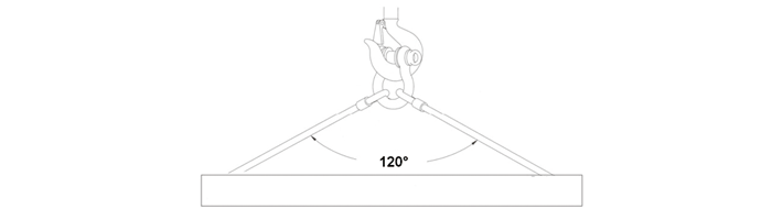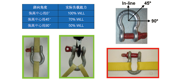 — 卸扣作為主環(huán)使用時(shí),左右兩條分肢必須呈對稱分布,而且兩條分肢之間的夾角最大不得超過120°。