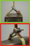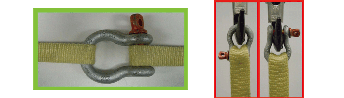 — 采用穿套吊法時(shí),索具分肢上的封閉節(jié)點(diǎn)必須與卸扣本體的弧頂位置而不是安全銷接觸。